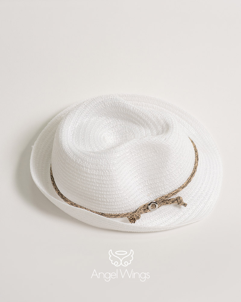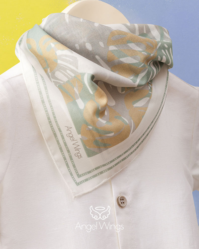 Το όλο σετ συνδυάζεται με ψάθινο καπέλο σε off white χρώμα και φουλάρι εμπριμέ τυπωτό σε αποκλειστικό καμβά της AW σε χρώματα μπεζ-acqua-γκρι.
