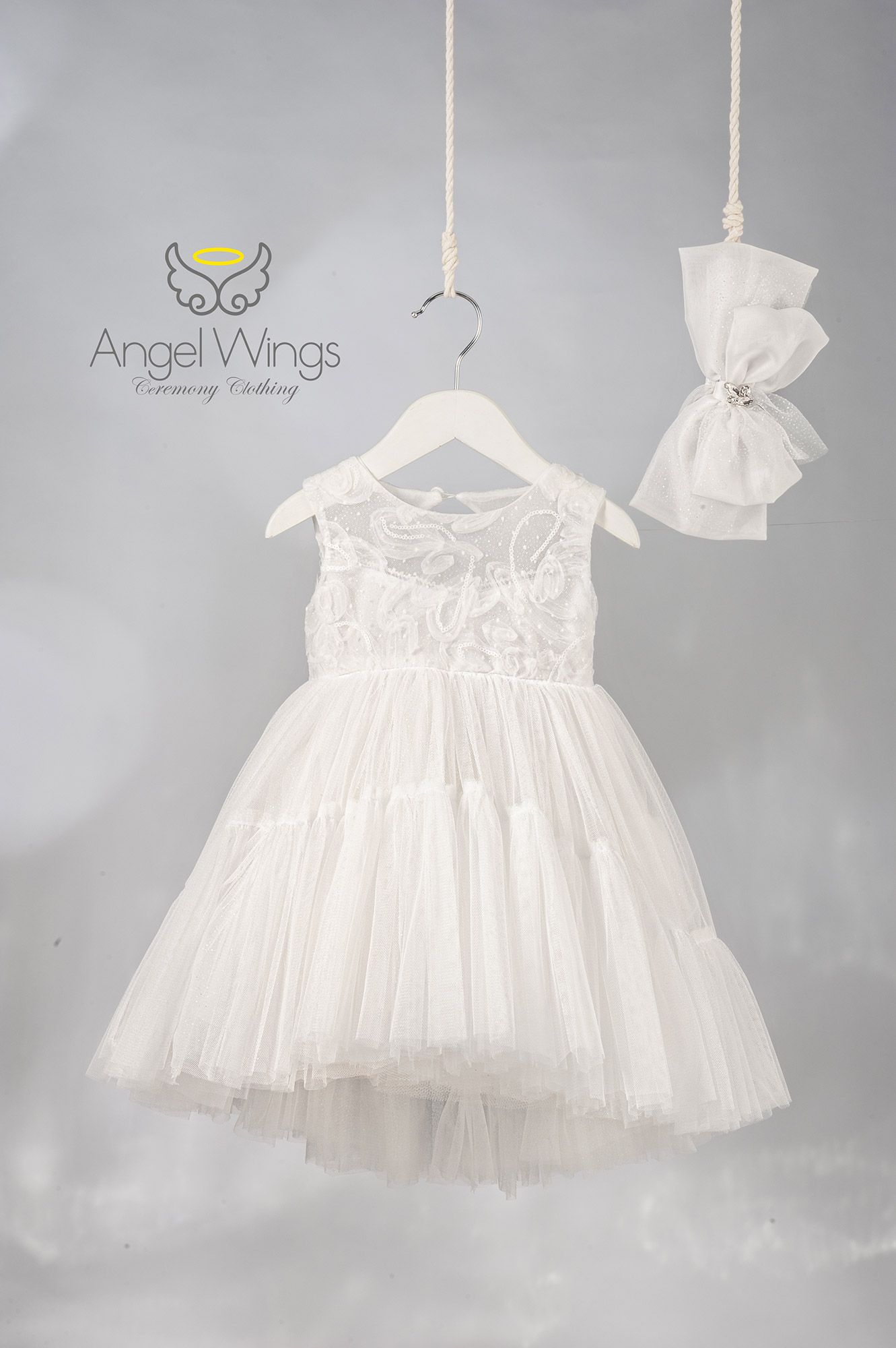 Το σύνολο ολοκληρώνεται αρμονικά με τούλινη κορδέλα μαλλιών διακοσμημένη με μεγάλους φιόγκους, προσθέτοντας μια κομψή και ρομαντική πινελιά στο look.