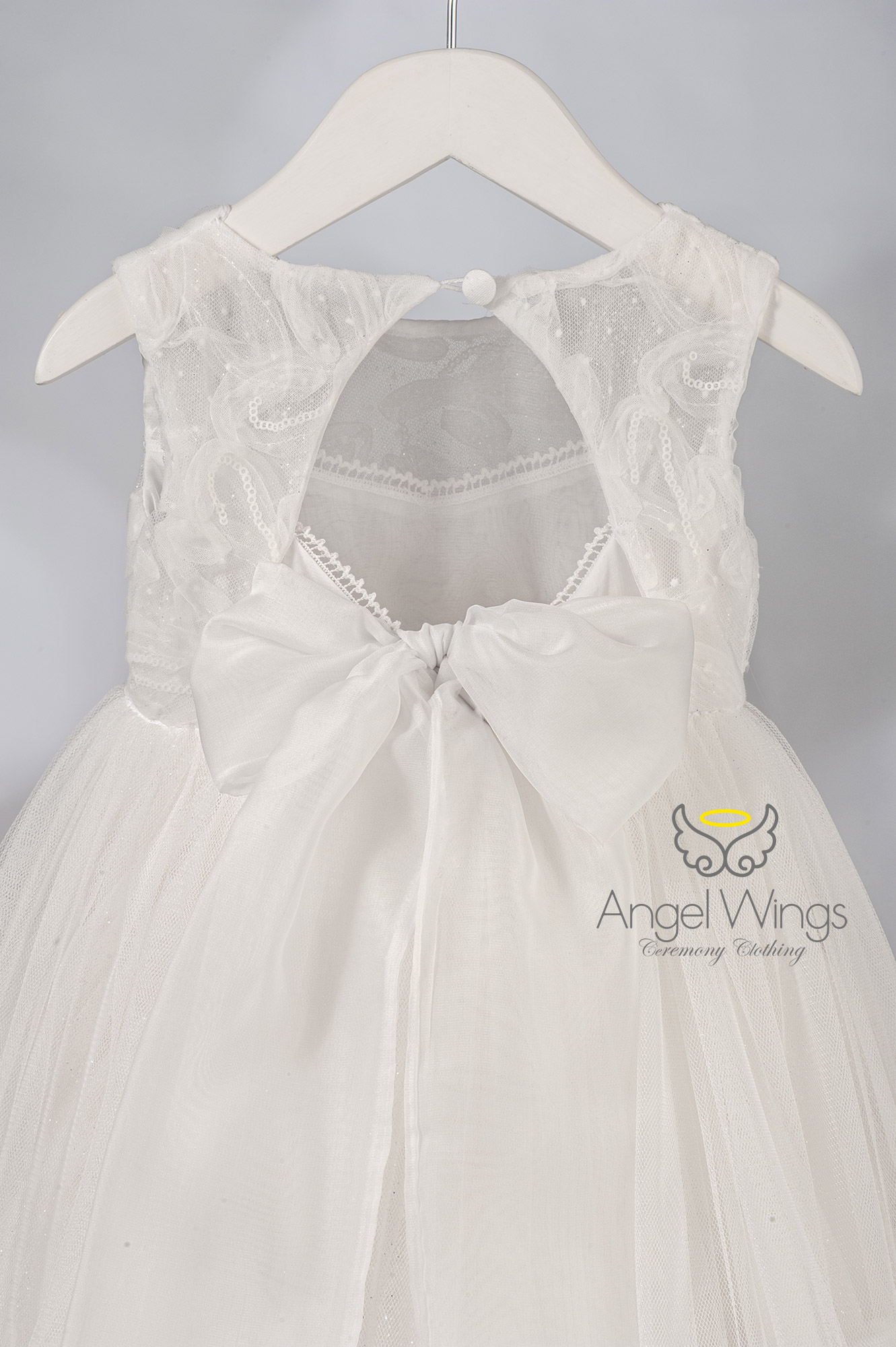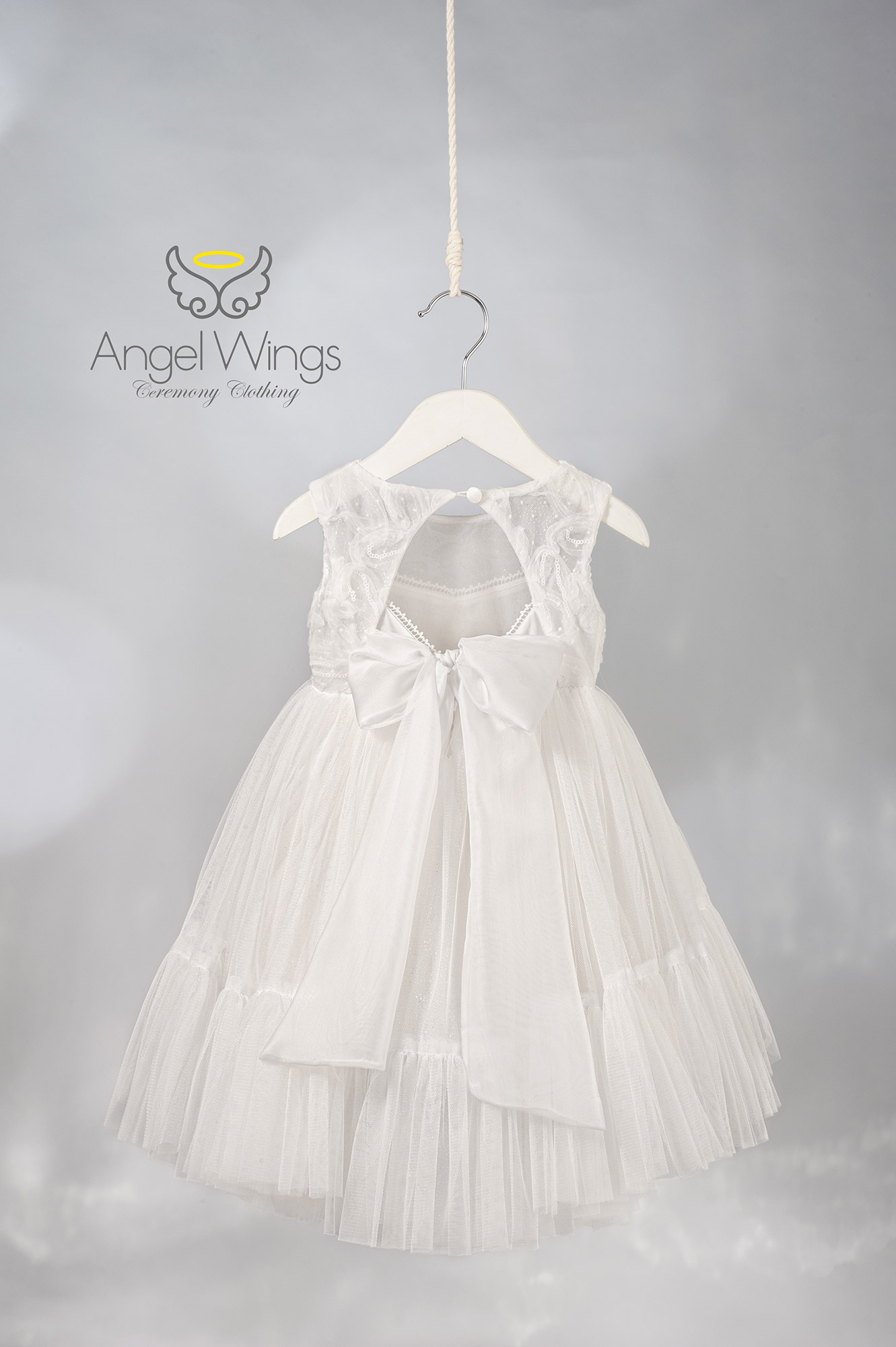 Η εντυπωσιακή ανοιχτή πλάτη αναδεικνύει τη φινέτσα του σχεδίου και δένει κομψά με ζώνη από απαλή μουσελίνα, δημιουργώντας μια ανάλαφρη και ρομαντική σιλουέτα. Η πλούσια φούστα από τούλι, ενισχυμένη με φουρό και διακοσμημένη με αέρινα βολάν, καταλήγει σε διακριτική ουρά στο πίσω μέρος, χαρίζοντας ονειρική κίνηση και παραμυθένια αίσθηση σε κάθε βήμα.