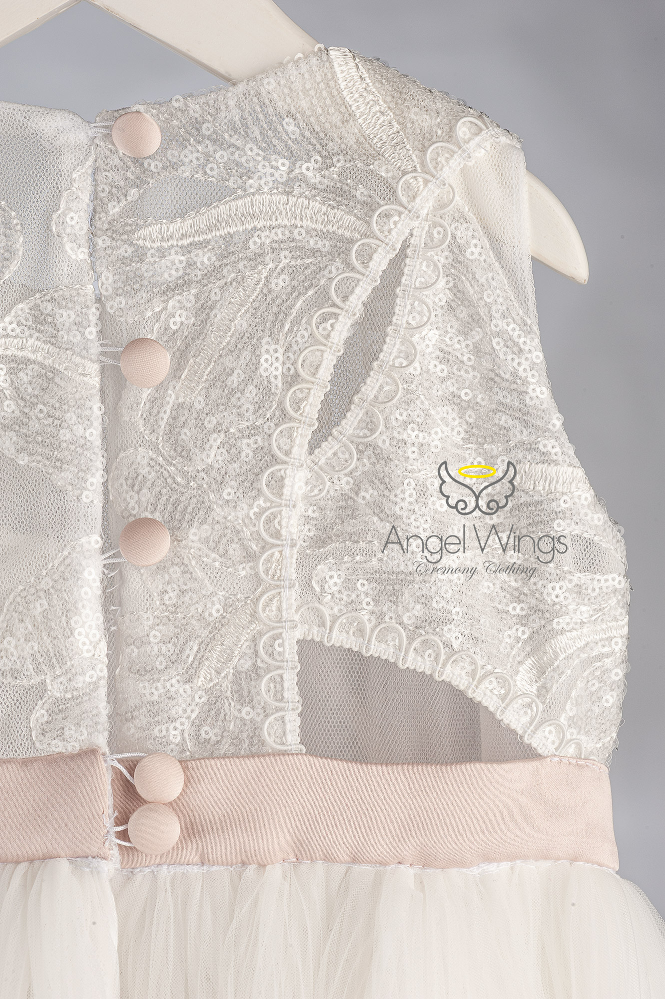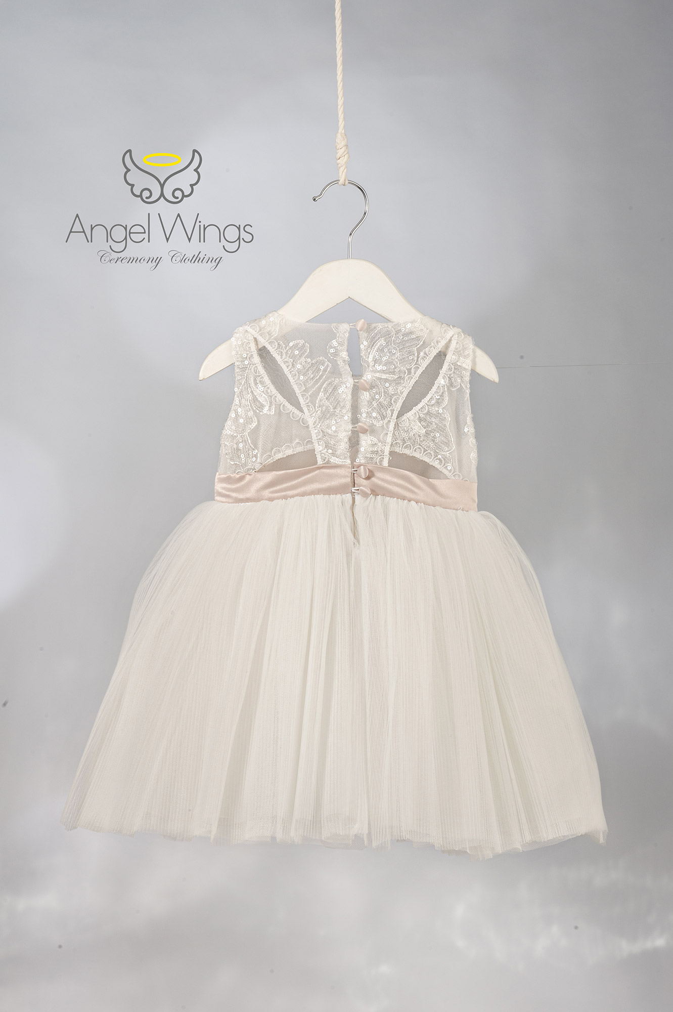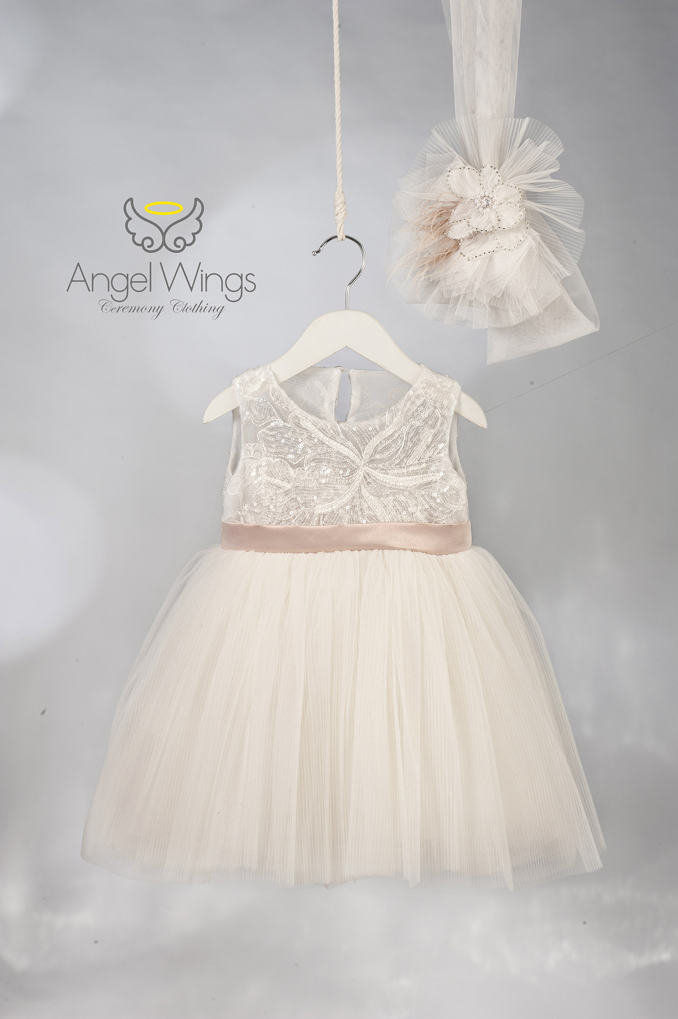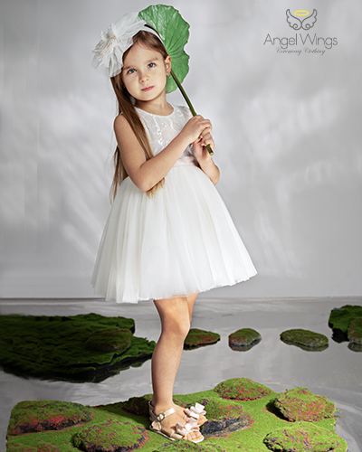 Η φούστα από πλισέ τούλι δημιουργεί πλούσια κίνηση και αέρινο όγκο, χαρίζοντας μια παραμυθένια αίσθηση σε κάθε βήμα. Το σύνολο ολοκληρώνεται αρμονικά με τούλινη κορδέλα μαλλιών, διακοσμημένη με εντυπωσιακό βολάν, φίνα λουλούδια και διακριτικά φτερά, προσθέτοντας μια ρομαντική και ιδιαίτερα κομψή πινελιά.