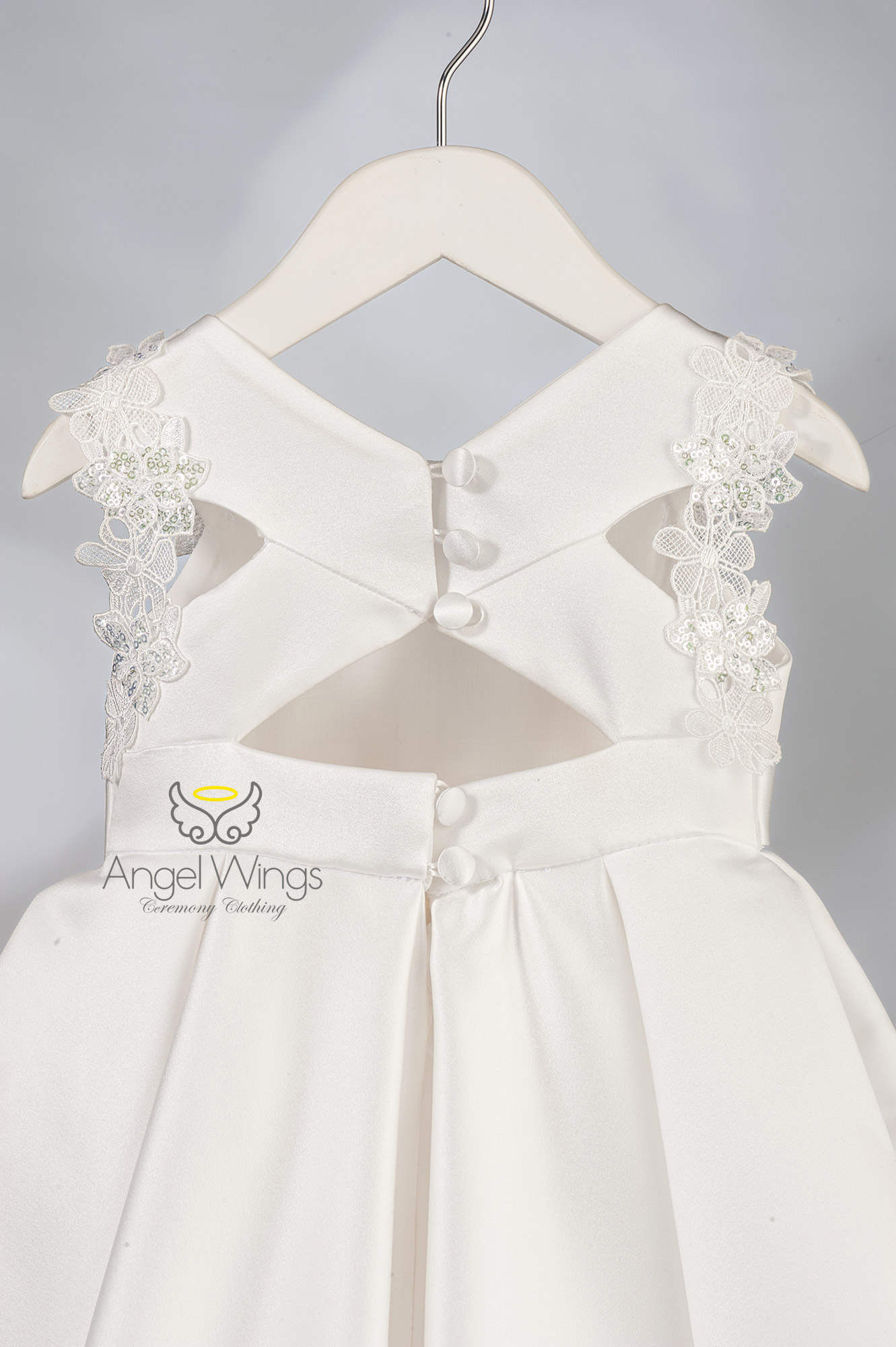Μια σύγχρονη και εξαιρετικά κομψή δημιουργία σε διαχρονική off-white απόχρωση, κατασκευασμένη από πολυτελές σατέν ντουσέζ που χαρίζει μοναδική δομή και φίνα λάμψη στο φόρεμα. Ο μοντέρνος σχεδιασμός του συνδυάζει την καθαρότητα των γραμμών με εντυπωσιακές λεπτομέρειες υψηλής αισθητικής.