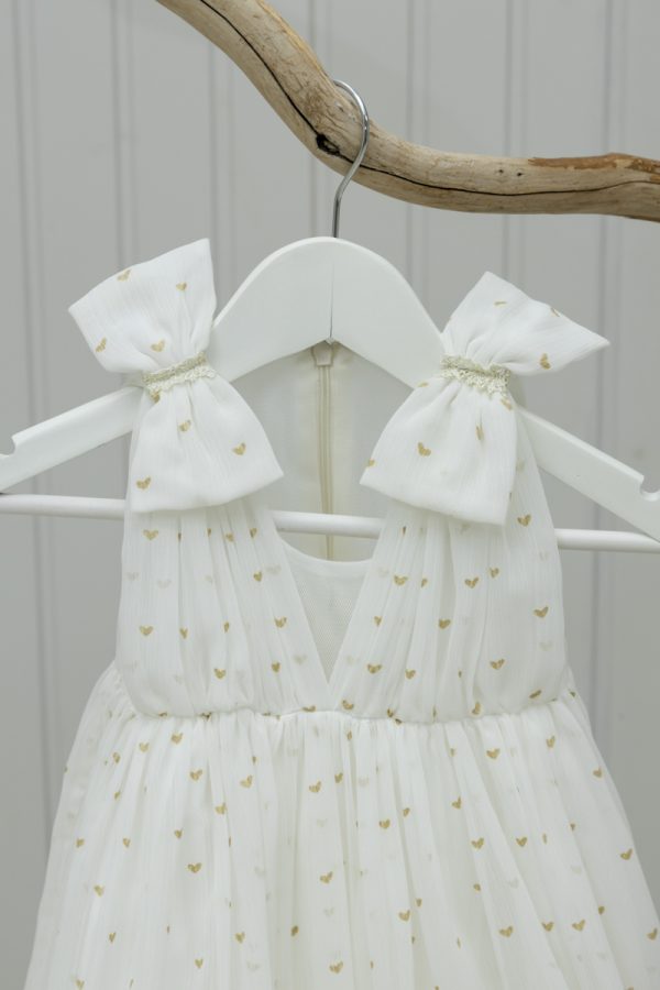 Αέρινο εκρού φόρεμα από γκοφρέ ύφασμα μουσελίνα με τύπωμα χρυσές καρδούλες, φιογκάκια στις τιράντες και βολάν στο τελειώμα.