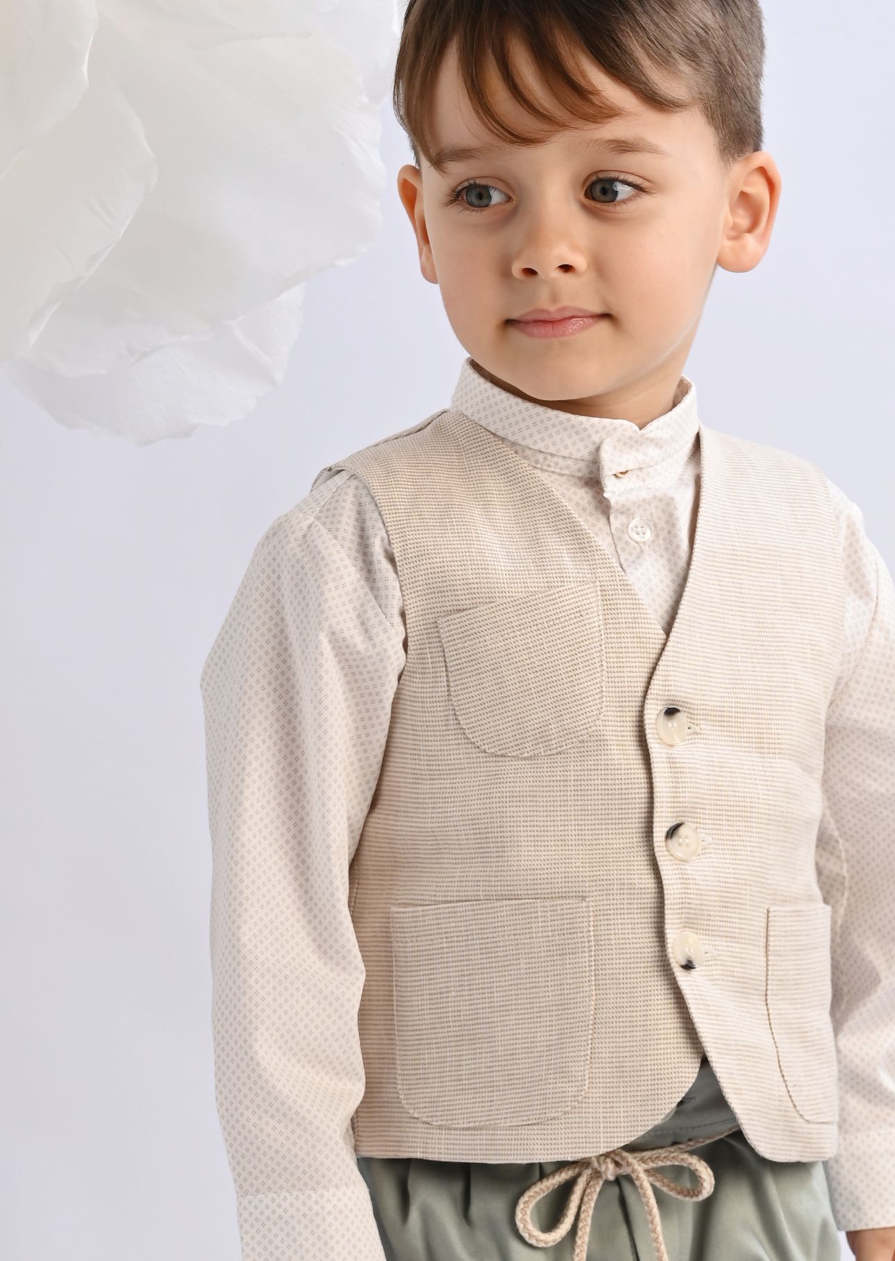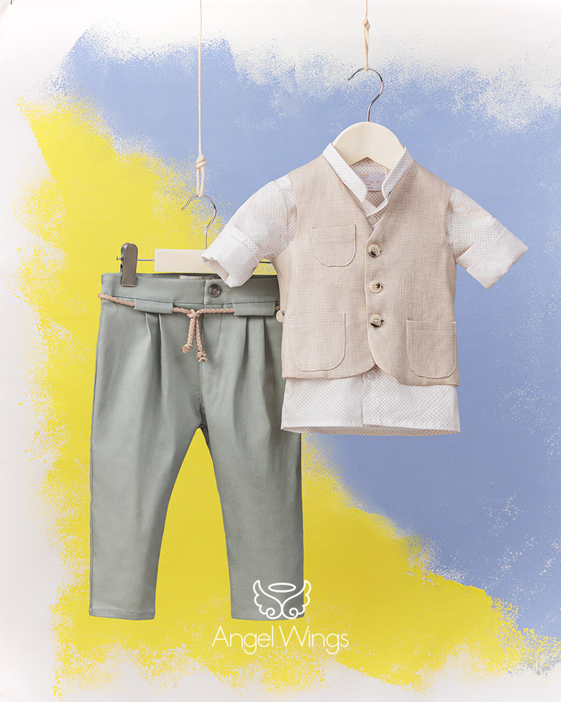 Γιλέκο φτιαγμένο από ένα ιδιαίτερο μελανζέ καμβά από λινό-βαμβάκι κ tencel ύφασμα στο χρώμα της άμμου με εξωτερικές τσέπες και ένα ιδιαίτερο μικρό τσεπάκι στο στήθος. Πουκάμισο από 100% βαμβακερό ύφασμα με μπεζ γεωμετρικά μίνι σχέδια με έναν πολύ ιδιαίτερο Μάο γιακά. Παντελόνι σε χρώμα μέντα από βαμβακερή καπαρντίνα με διπλές πιέτες και θυλάκια τούνελ που περνάει ζώνη κορδόνι.