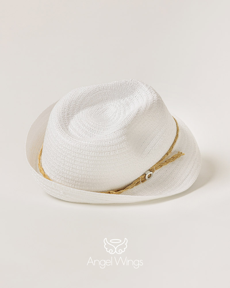 Το όλο σετ συνδυάζεται με ψάθινο καπέλο σε off white χρώμα με ασημένια μεταλλική λεπτομέρεια.
