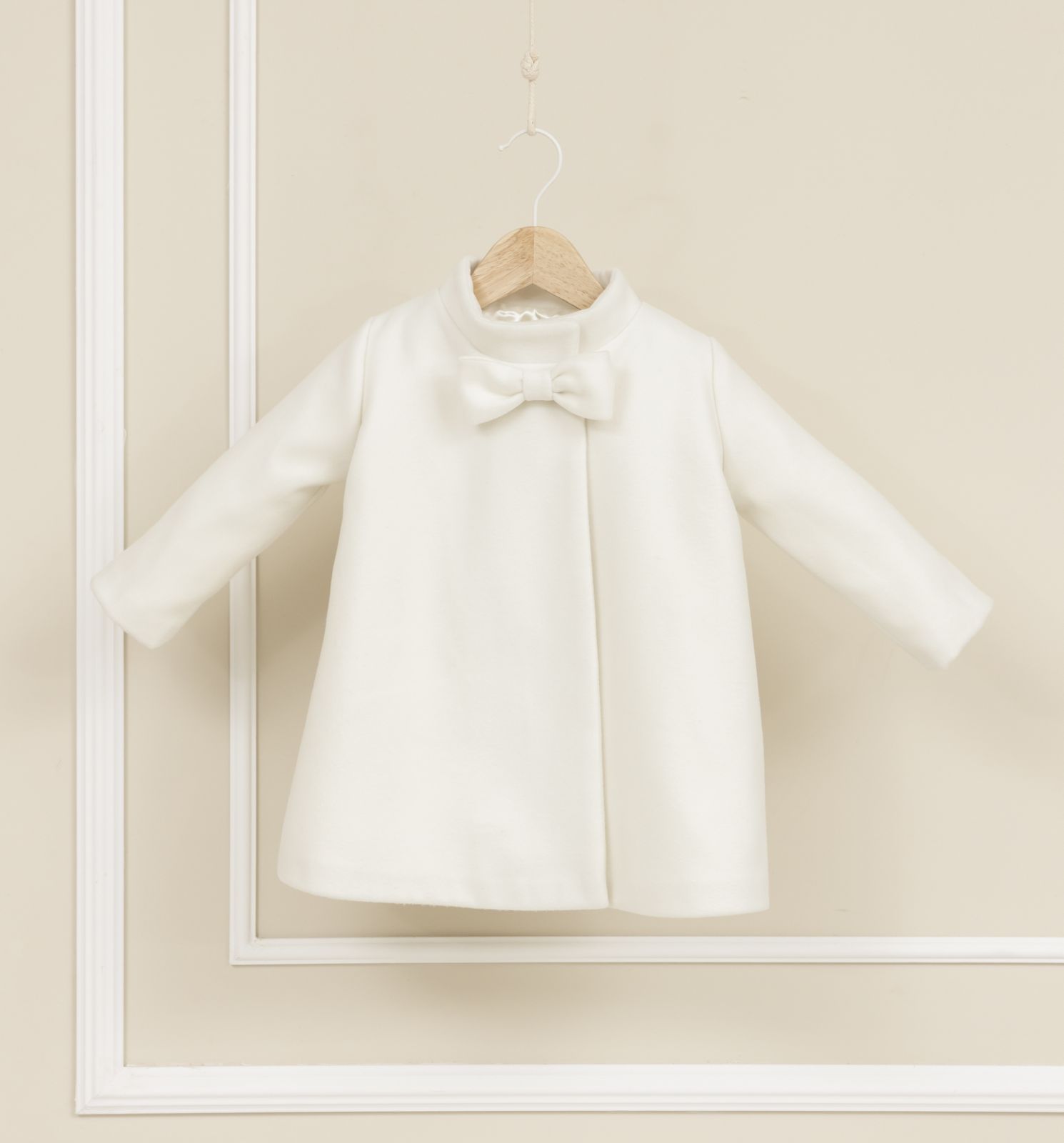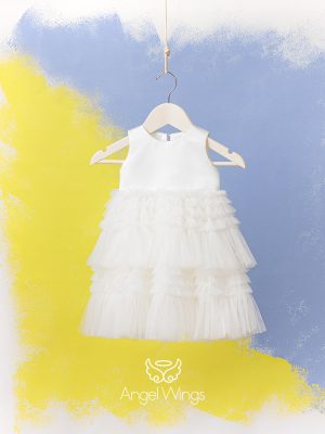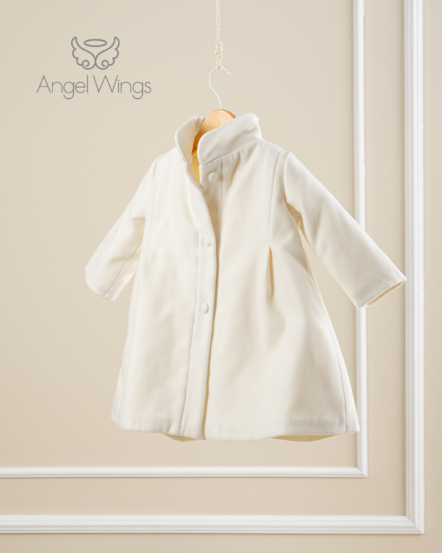 Απλό και όμορφο μαντό από βαμβακερό ανάγλυφο ύφασμα με κοντά μανικάκια από βολάν, ιδανικό για να συνδυαστεί με τα ρούχα της βάπτισης.