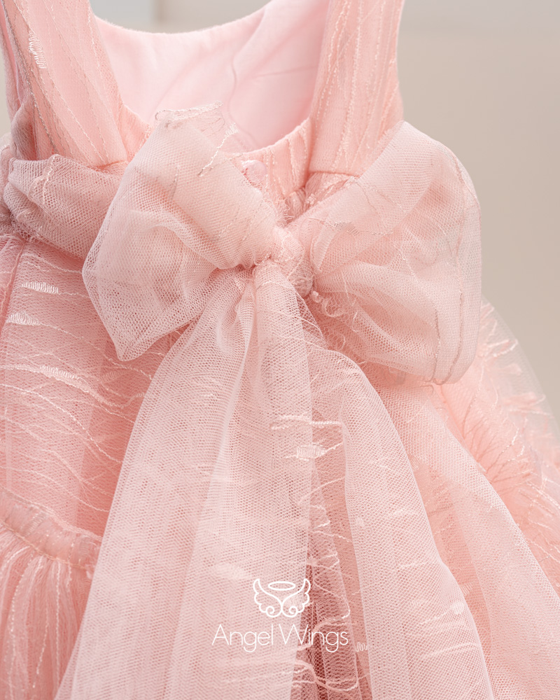 Η σουρωτή φούστα με τα ασύμμετρα φύλλα, τα έξτρα βολάν και την ζώνη που καταλήγει σε εντυπωσιακό φιόγκο πίσω είναι από το ίδιο τούλι του μπούστου.