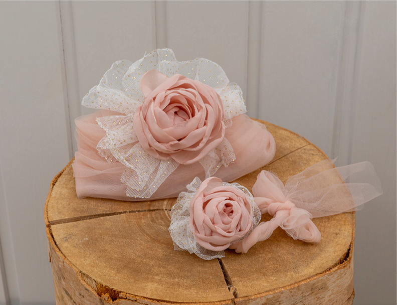 Κορδέλα από τούλι που δένει πίσω σε φιόγκο με διακοσμητικό υπέροχο χειροποίητο τριαντάφυλλο από ζορζέτα και τούλι. Ασορτί μπουτονιέρα-βραχιόλι για το χεράκι.