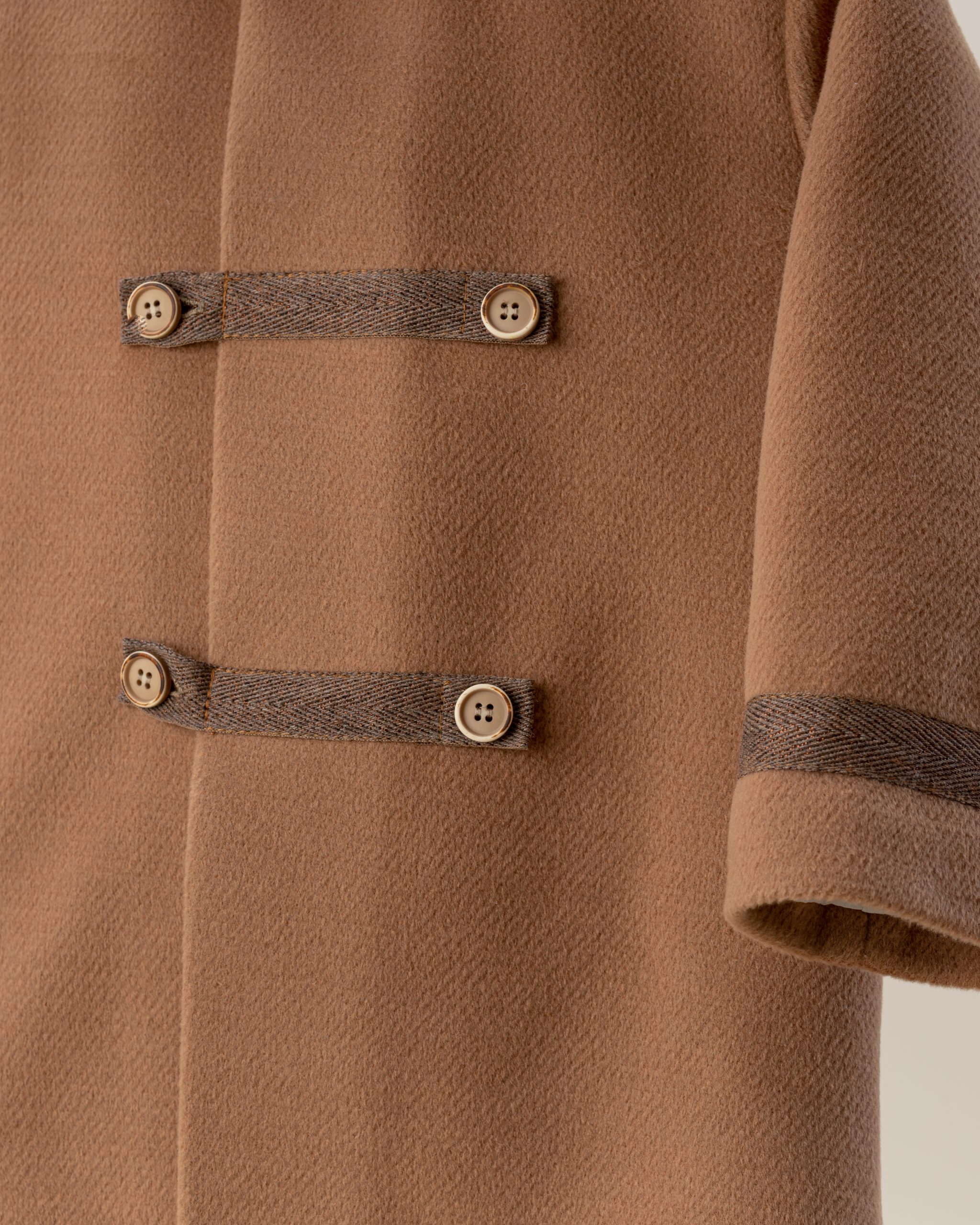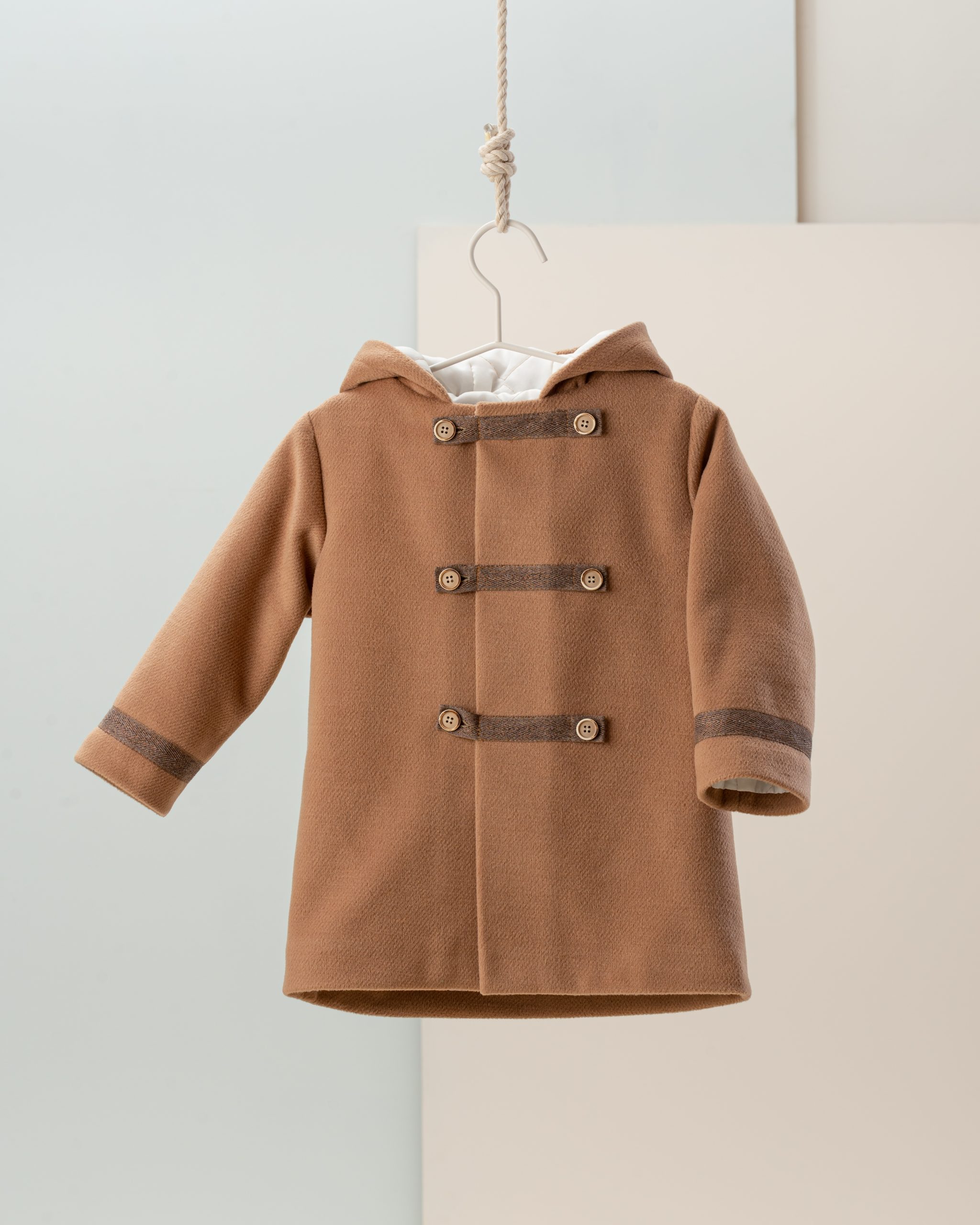 | Εβαζέ μάλλινο παλτό σε καφέ χρώμα με αποσπώμενη κουκούλα με καφε λεπτομέρειες στο κούμπωμα .Εσωτερικά είναι επενδυμένο με φόδρα καπιτονέ |