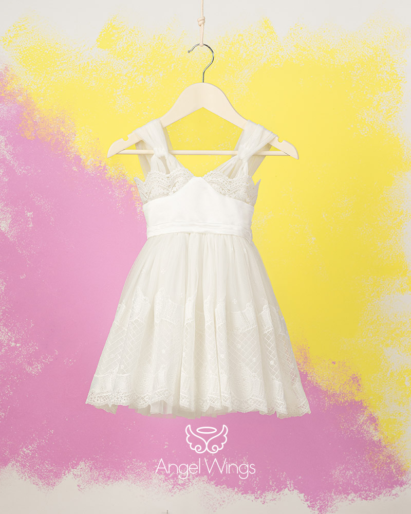 Ένα κομψό και ξεχωριστό μεσάτο φόρεμα σε off white χρώμα από κεντημένο τούλι με κομμάτια Broderie anglaise και σατέν ντουσέζ.