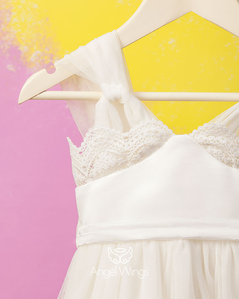 Το πάνω μέρος είναι με φαρδιά τιράντα απο τούλι και με ένα μοναδικό σχέδιο φτιαγμένο από δαντέλα, τούλι, και φάσα από σατέν. Η φούστα πλούσια φτιαγμένη από αυτό το καταπληκτικό κεντημένο τούλι με το πολύ ιδιαίτερο τελείωμα. Το φόρεμά σφίγγει πισω εύκολα, με ζώνη από τούλι δημιουργόντας εναν εκπληκτικό φιόγκο.