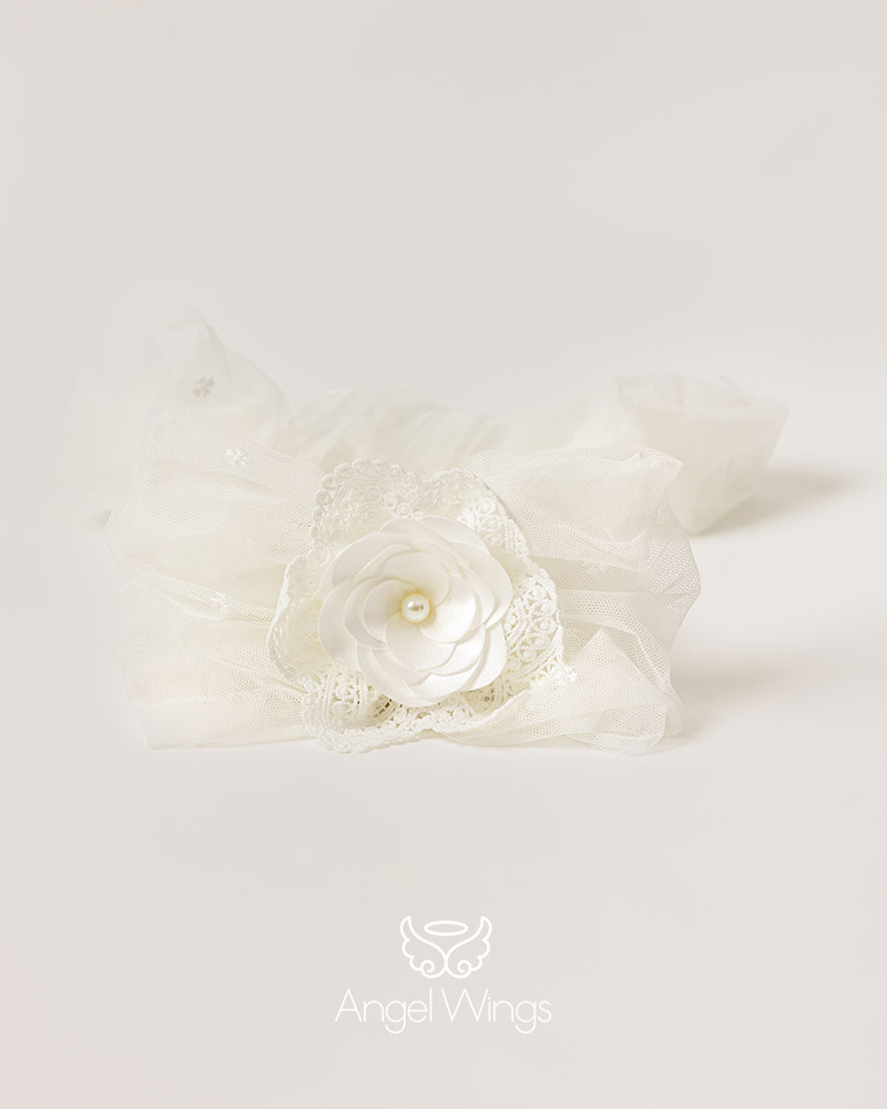 Το σύνολο ολοκληρώνεται υπέροχα με κορδέλα μαλλιών από τούλι και χειροποίητο φιόγκο με λουλούδι.