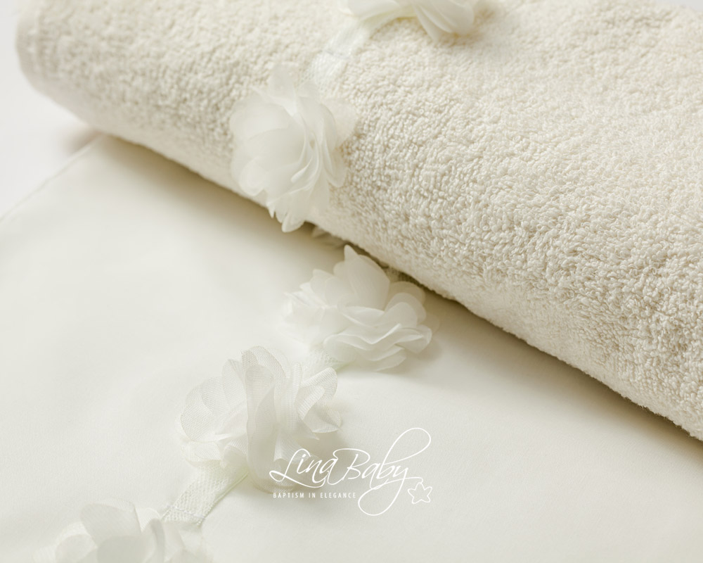 Ρομαντικό βαμβακερό σετ λαδόπανων σε ivory χρώμα με σατέν κορδέλα και σειρά από απλικέ διακοσμητικά λουλούδια.