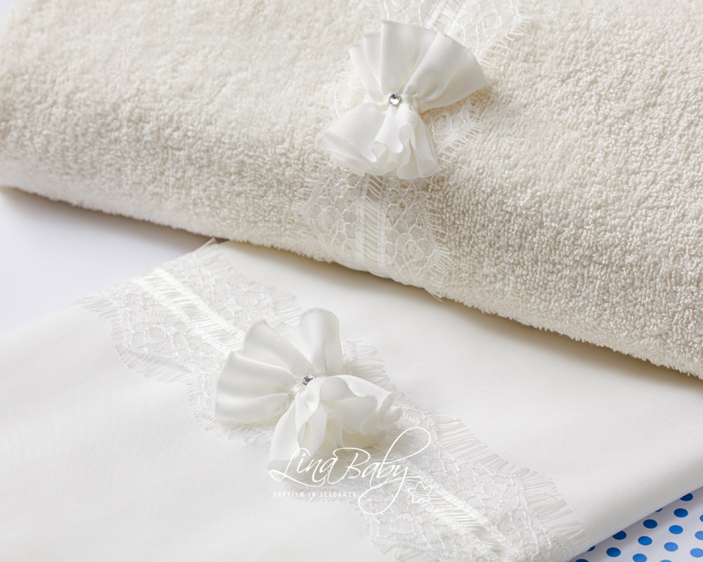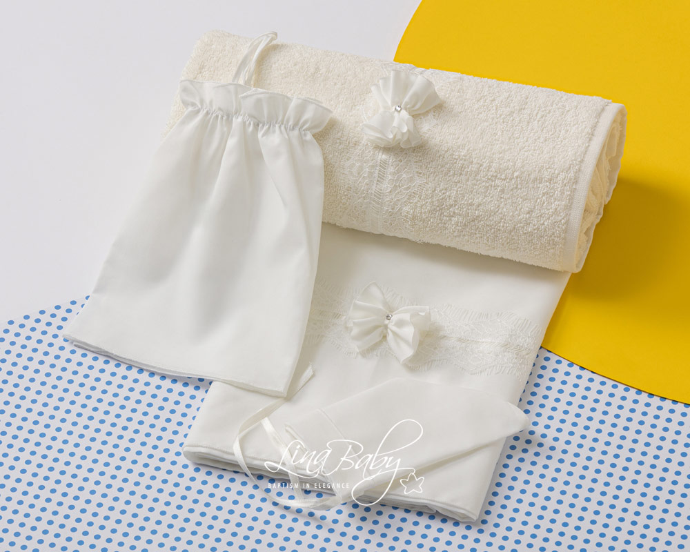 Απλό και φινετσάτο βαμβακερό σετ λαδόπανων σε εκρού χρώμα με τρέσα από γαλλική δαντέλα και σατέν κορδέλα.
