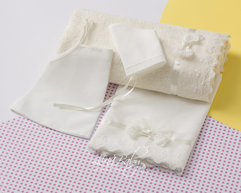 Διατίθεται σε ιβουάρ χρώμα με δαντέλα στο τελείωμα, σατέν τρέσα και εντυπωσιακό διακοσμητικό φιόγκο από την ίδια του την δαντέλα.