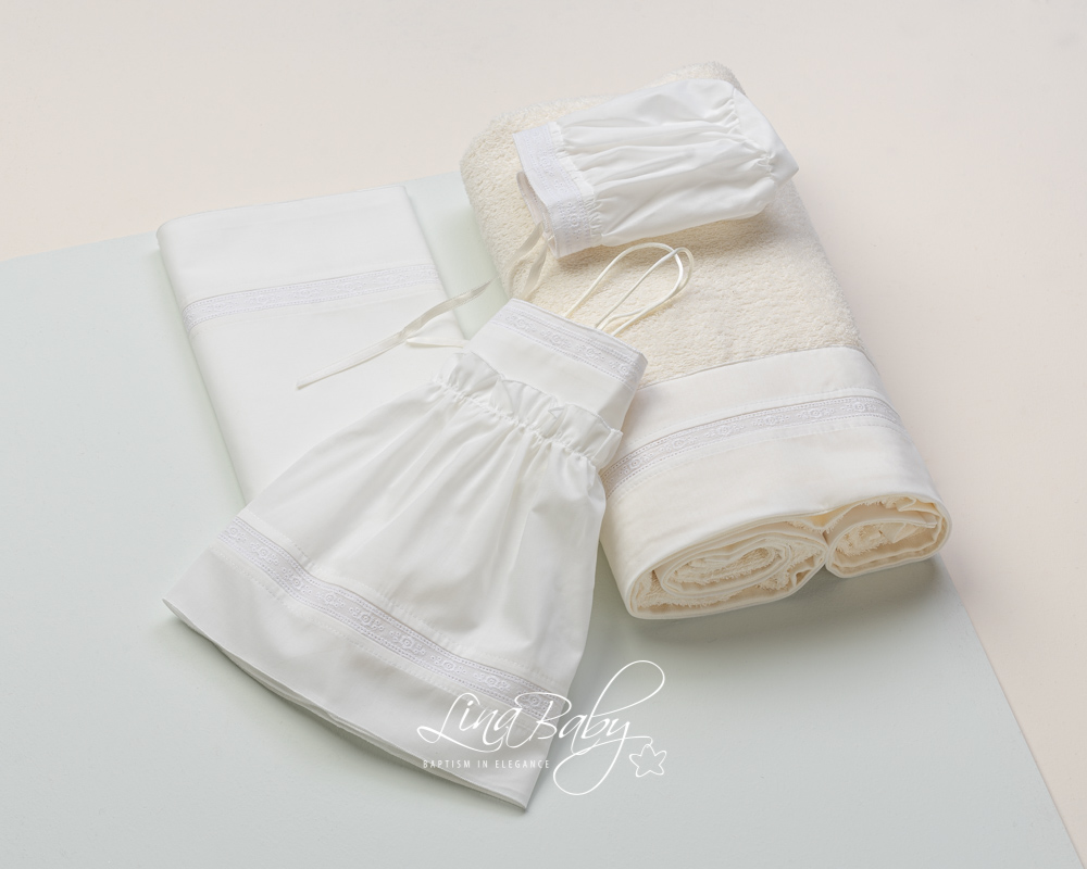| Βαμβακερό σετ λαδόπανου σε δύο χρώματα λευκό και ιβουάρ, με διακοσμητική βαμβακερή φάσα και τρέσα δαντέλας Broderies Anglais. Πετσέτα 90*140*450g. |