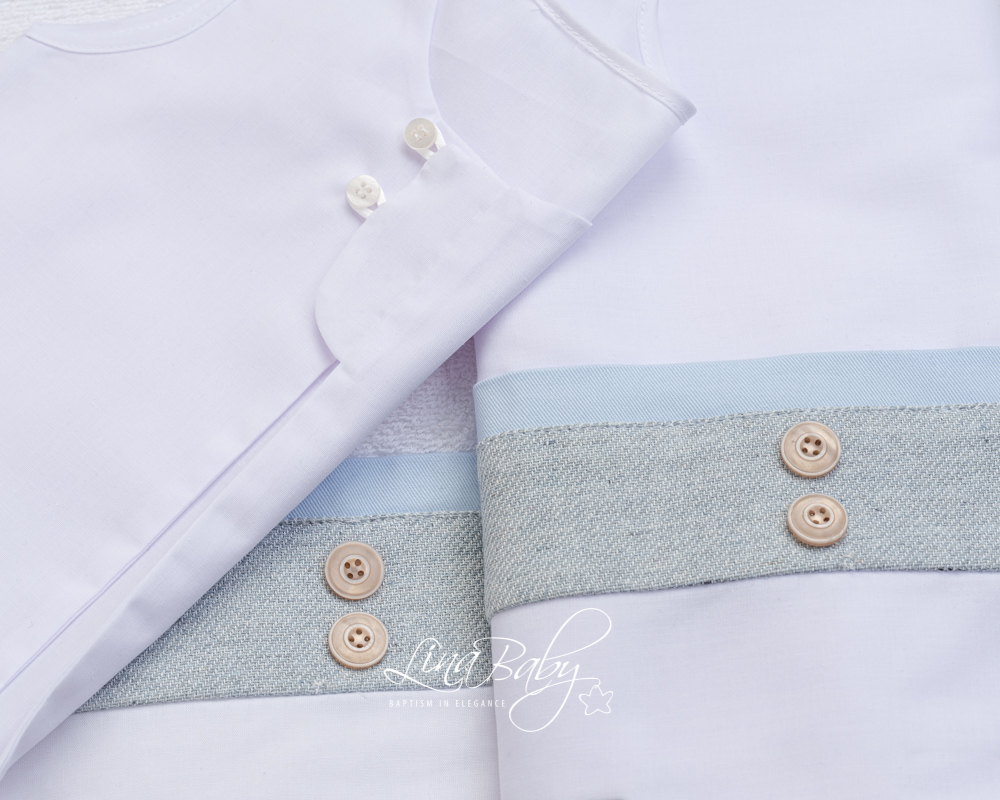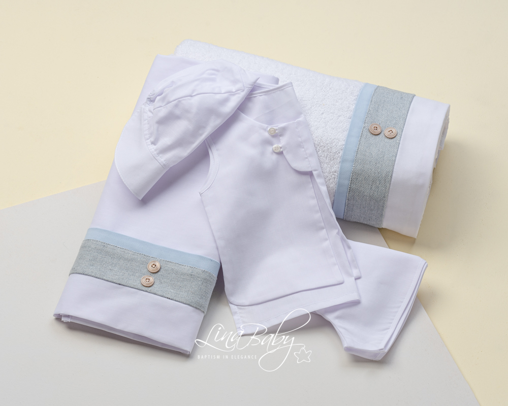 | Βαμβακερό σετ λαδόπανου σε λευκό χρώμα με διακοσμητικές υφασμάτινες φάσες σε γκρι και σιέλ χρώμα και μπεζ διακοσμητικά κουμπάκια.Πετσέτα 90*140*360g. |