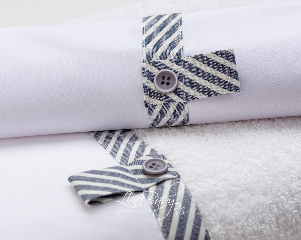 Βαμβακερό σετ  λαδόπανου σε 3 χρώματα.  Με τρέσα από ριγέ διαγωνάλ σχέδιο σε μπλέ- λευκό ,εκρού-λευκό και μπεζ-εκρού αντίστοιχα και διακοσμητικό κουμπάκι. Πετσέτα 90*140*360g.