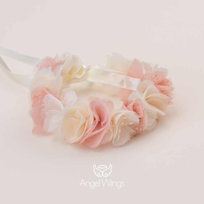Ενα υπέροχο Στεφανάκι από χειροποίητα μικρά λουλούδια σε εκρού και ροζ χρωματισμούς.